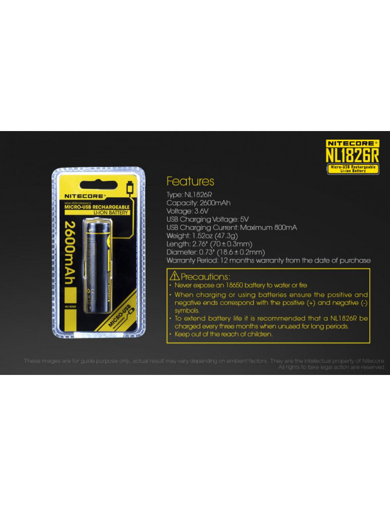 Akumulátor NITECORE typ 18650 Li-ion 2600 mAh s Micro USB nabíjacím portom. Micro USB nabíjací port umožňuje nabíjanie akumulátora priamo pomocou pripojeného Micro USB kábla.