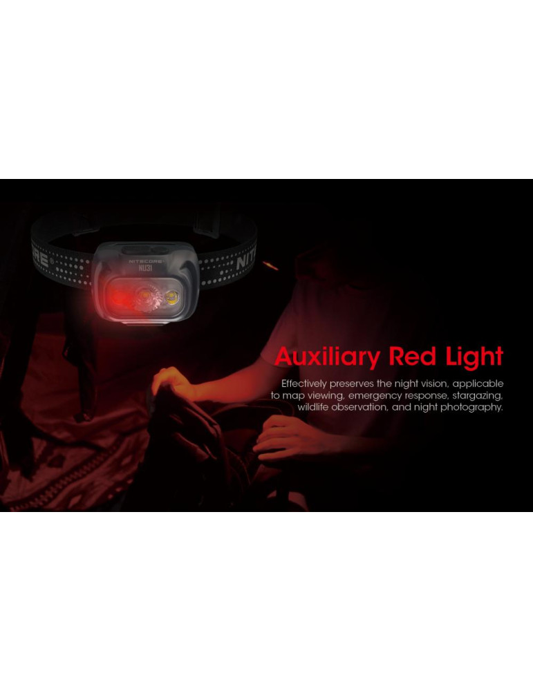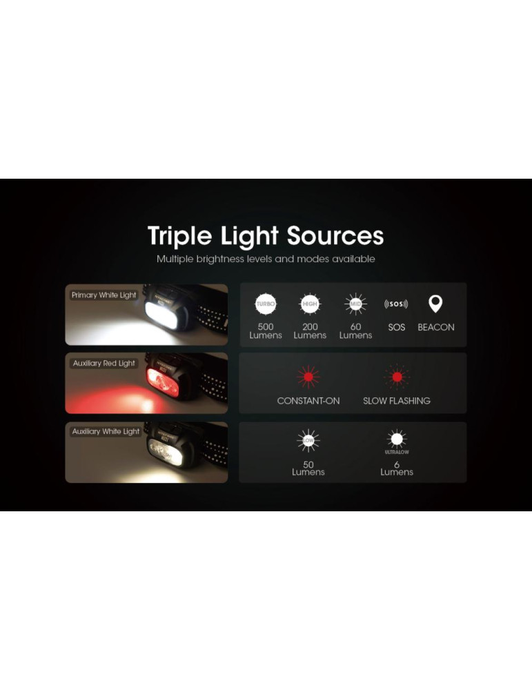 - Dva prepínače ovládajú režim bieleho svetla - tri intenzity a červeného svetla - jedena intenzita a jeden blikací mód