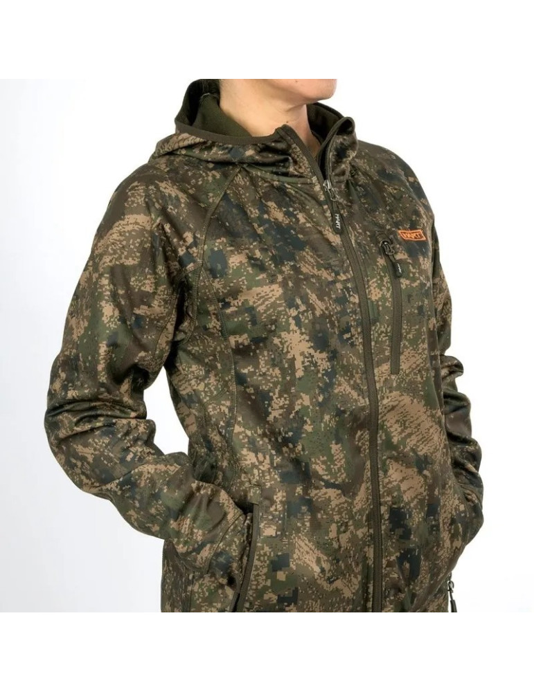 Vystužená bunda pre aktívny lov. Plecia v oranžovej farbe pre lepšiu viditeľnosť. So všetkými funkčnými vreckami, ktoré budete potrebovať: 2 vrecká, 2 slučky s chlopňami a vrecká na chrbte. Ľahká kapucňa so zipsom. PU membránové laminované a lepené švy. Vysoká nepriepustnosť (8000 mm) a priedušnosť (5000 g / m2).