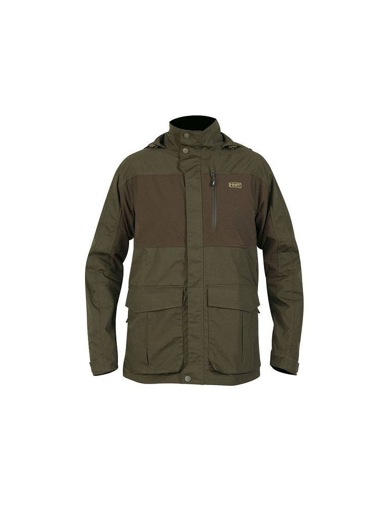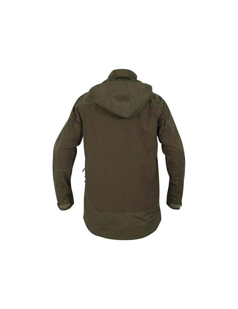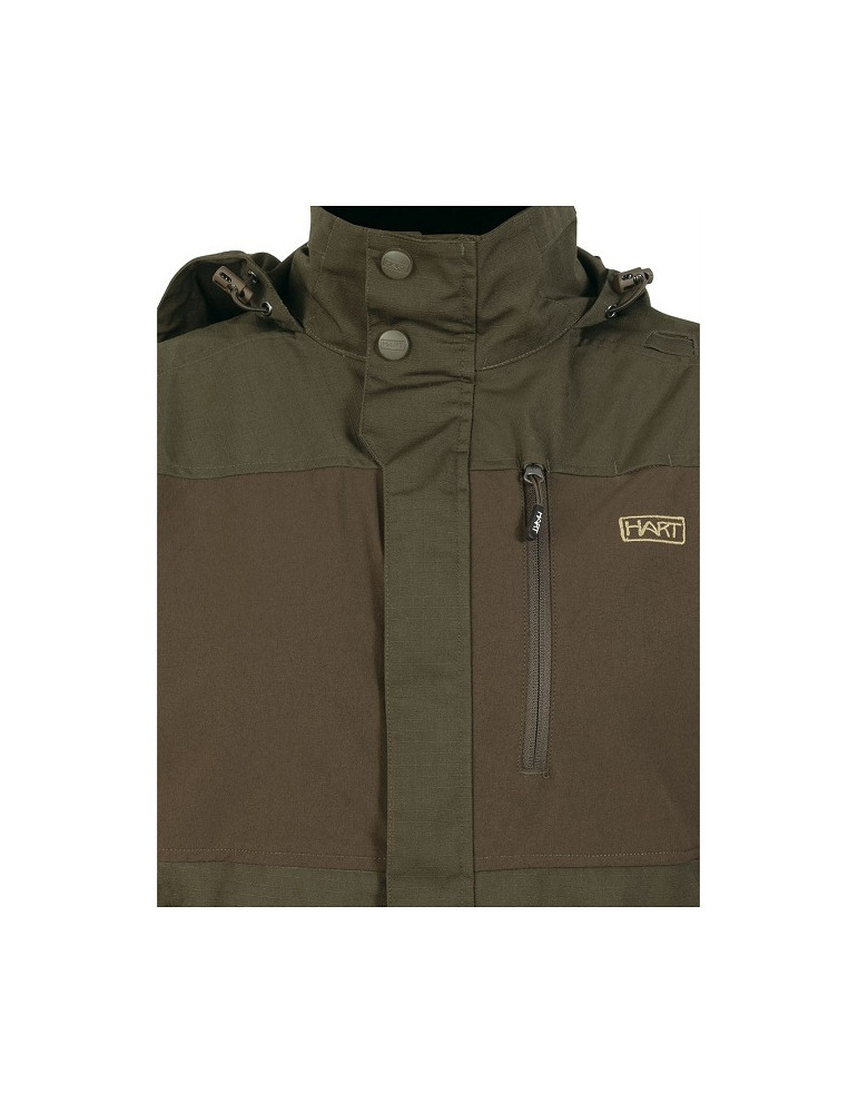 Odolná a vodoodpudivá rip-stopová konštrukcia tkaniny z bavlny. Kusy strečovej látky pre väčšie pohodlie. Náprsné vrecko na rádio-GPS so zipsom (s otvorom a vodiacou slučkou na anténu). Vnútorné vrecko na hrudi na zips. 2 veľkokapacitné cargo vrecká s 2 bočnými vreckami na zips. Herné vrecko na zips na uskladnenie alebo vetranie. Nastaviteľná kapucňa zložená vo vnútri goliera.