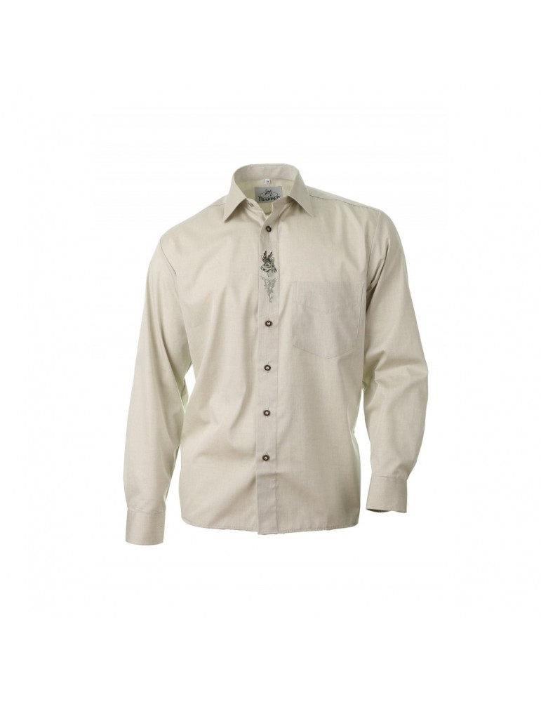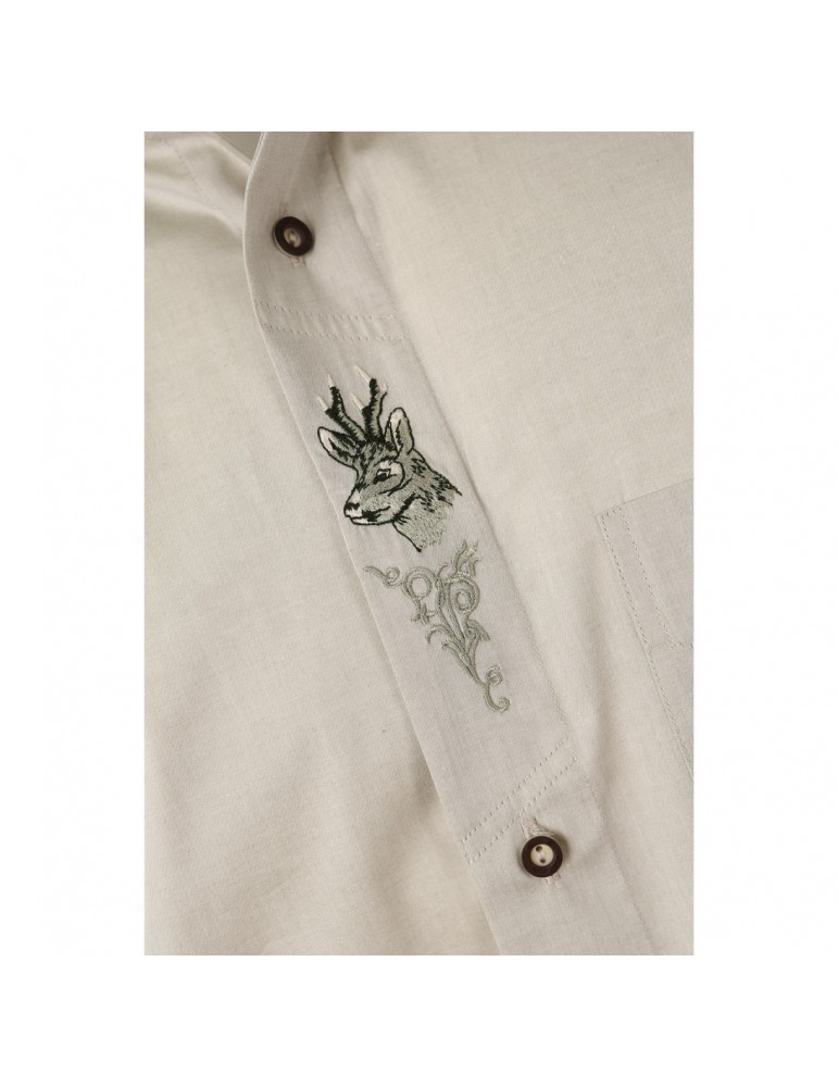 Veľmi pekná pánska košeľa s dlhým rukávom, zo zmesového materiálu, v bledozelenej farbe a s výšivkou srnčeka na prednej lége. Vhodná do oblekov a na spoločenské udalosti.