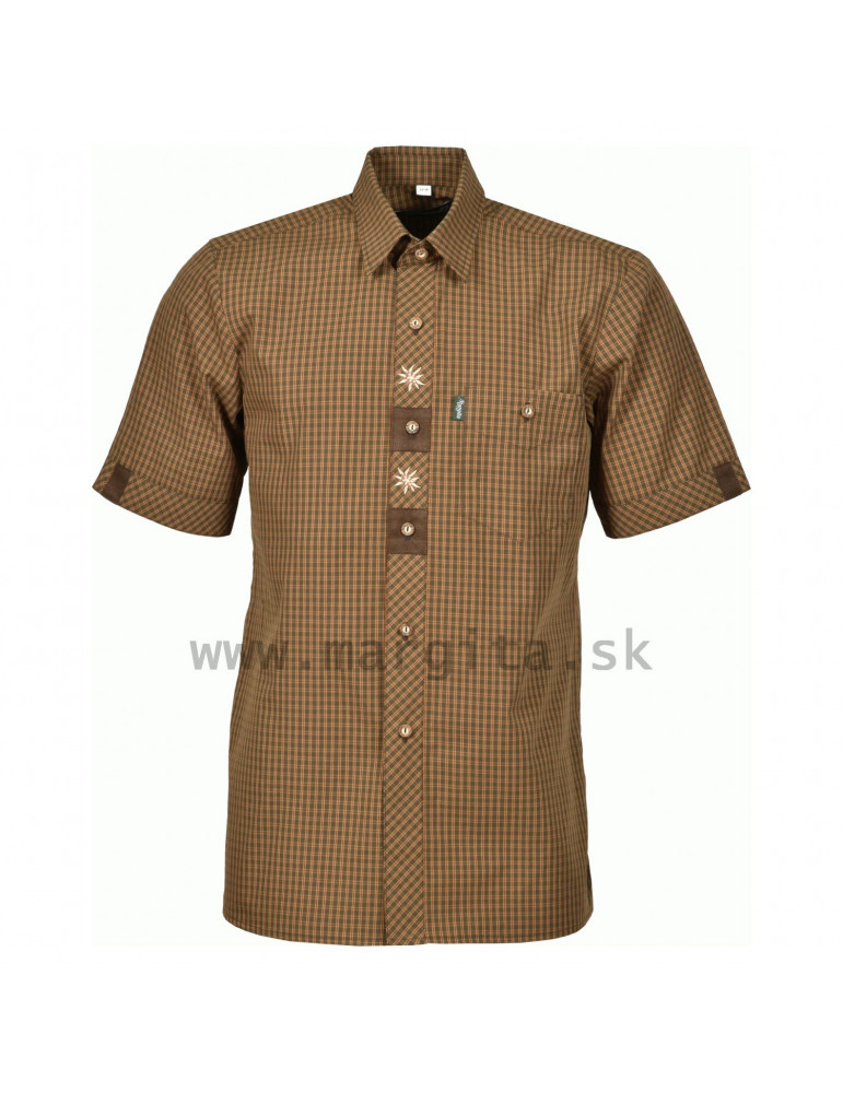 Pánska hnedá károvaná košeľa s krátkym rukávom. Materiál je príjemná 100% bavlna. Košeľa má vpredu jedno vrecko s gombíkom. Gombíky sú vyrobené v imitácii parožia. Na prednej lége je košeľa zdobená výšivkou plesnivca doplnená hnedými kockami, ktoré sa tiež nachádzajú aj na rukávoch. Košeľa je vhodná na slávnostné príležitosti, ale tiež aj na bežné každodenné nosenie.